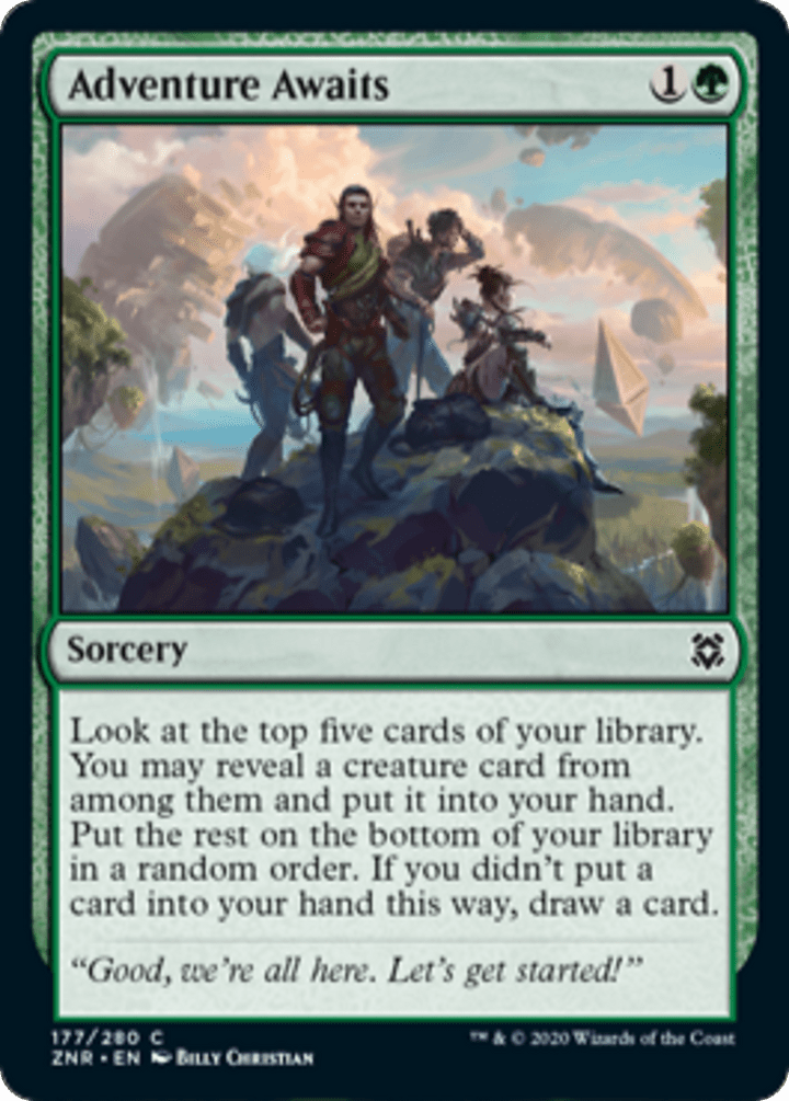 Look at the top five cards of your library. You may reveal a creature card from among them and put it into your hand. Put the rest on the bottom of your library in a random order. If you don’t put a card into your hand this way, draw a card.