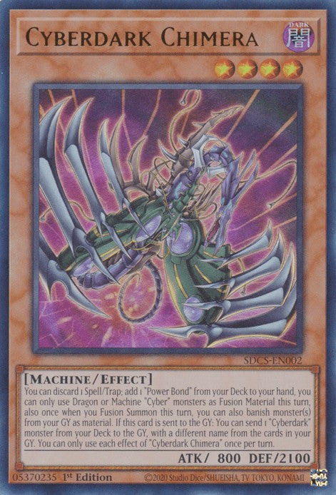 You can discard 1 Spell/Trap; add 1 "Power Bond" from your Deck to your hand, you can only use Dragon or Machine "Cyber" monsters as Fusion Material this turn, also once when you Fusion Summon this turn, you can also banish monster(s) from your GY as material. If this card is sent to the GY: You can send 1 "Cyberdark" monster from your Deck to the GY, with a different name from the cards in your GY. You can only use each effect of "Cyberdark Chimera" once per turn.
