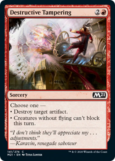 Choose — • Destroy target artifact. • Creatures without flying can't block this turn.