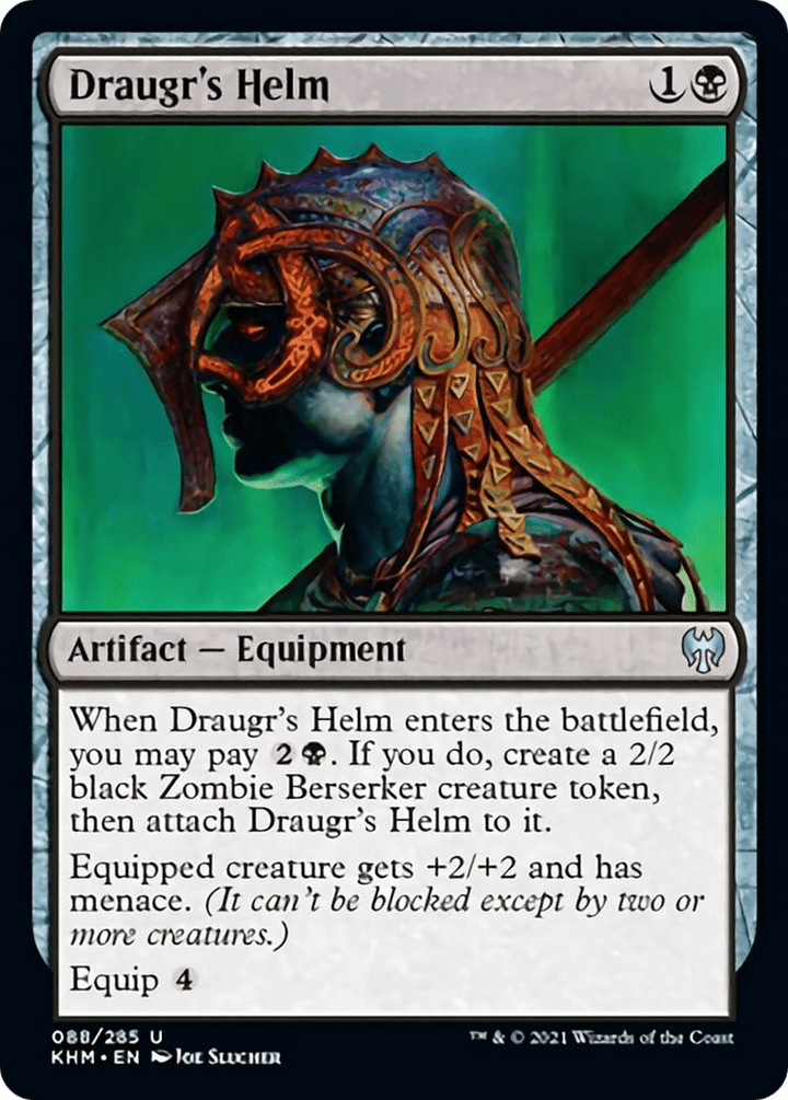 When Draugr's Helm enters the battlefield, you may pay 2B. If you do, create a 2/2 black Zombie Berserker creature token, then attach Draugr's Helm to it.