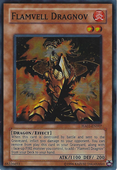 When this card was destroyed by battle and sent to the Graveyard, inflict 500 damage to your opponent. You can remove this card in your Graveyard and 1 face-up FIRE monster you control from play to add 1 Flamvell Dragnov from your Deck to your hand.