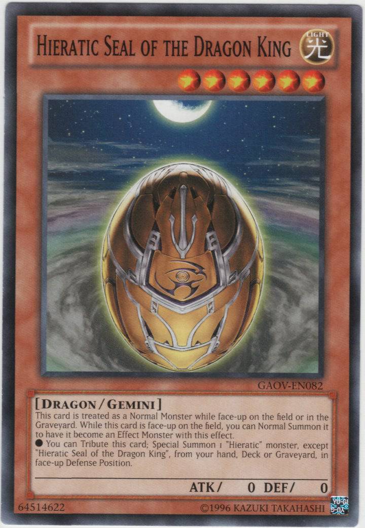 This card is treated as a Normal Monster while face-up on the field or in the Graveyard. While this card is face-up on the field, you can Normal Summon it to have it be treated as an Effect Monster with this effect. // * You can Tribute this card; Special Summon 1 "Hieratic" monster, except "Hieratic Seal of the Dragon King", from your hand, Deck, or Graveyard, in face-up Defense Position.