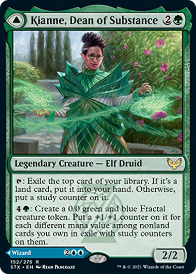 4G: Create a 0/0 green and blue Fractal creature token. Put a +1/+1 counter on it for each different mana value among nonland cards you own in exile with study counters on them.
