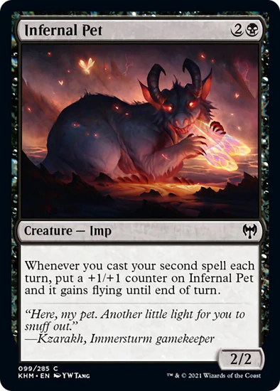 Whenever you cast your second spell each turn, put a +1/+1 counter on Infernal Pet and it gains flying until end of turn.