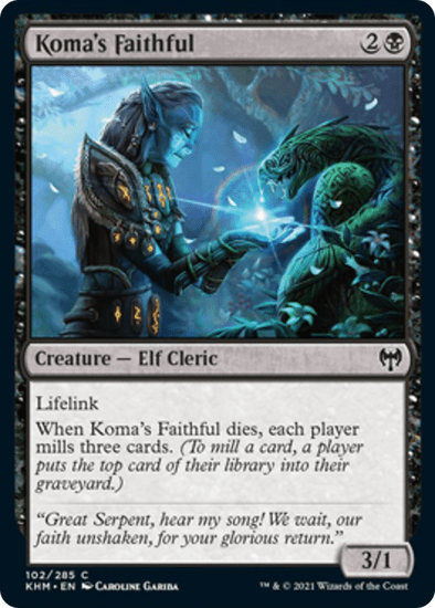 When Koma’s Faithful dies, each player mills three cards. (To mill a card, a player puts the top card of their library into their graveyard.)