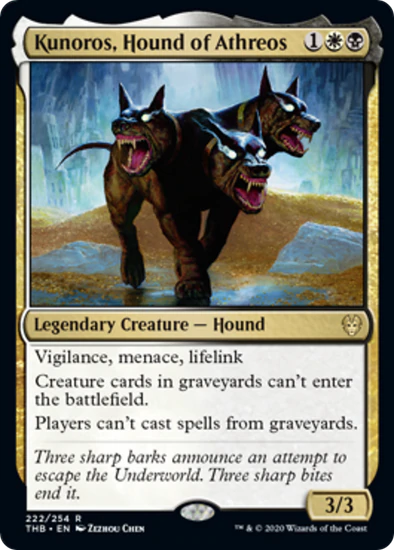 Vigilance, menace, lifelink Creature cards in graveyards can’t enter the battlefield. Players can’t cast spells from graveyards.