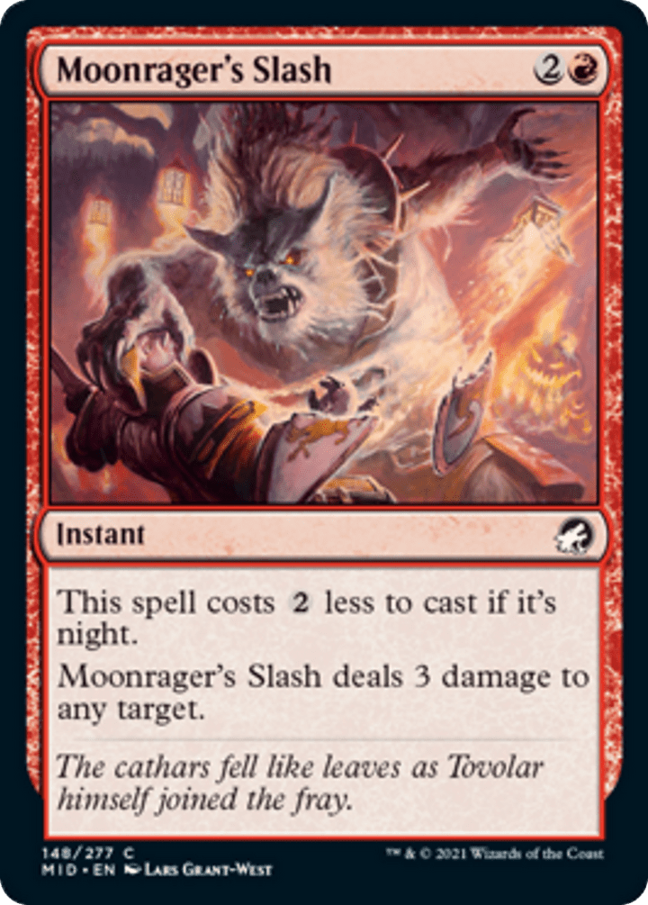 This spell costs 2 less to cast if it's night. Moonrager's Slash deals 3 damage to any target.