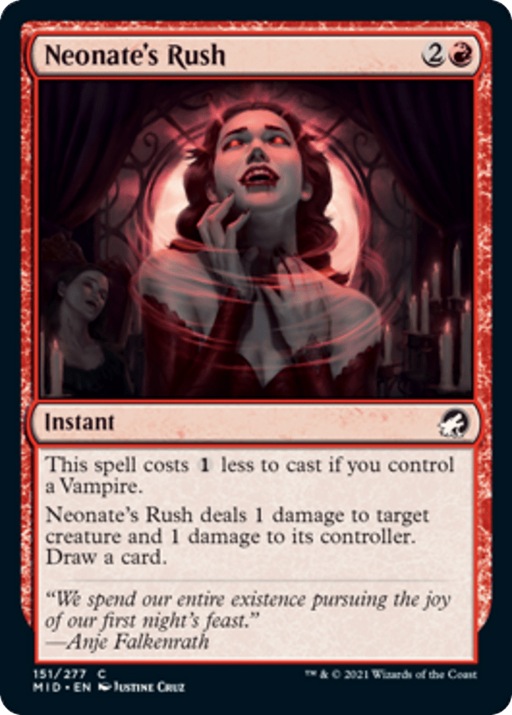 Neonate's Rush deals 1 damage to target creature and 1 damage to its controller. Draw a card.