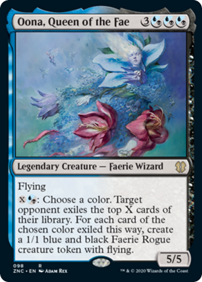 X(U/B): Choose a color. Target opponent exiles the top X cards of their library. For each card of the chosen color exiled this way, create a 1/1 blue and black Faerie Rogue creature token with flying.