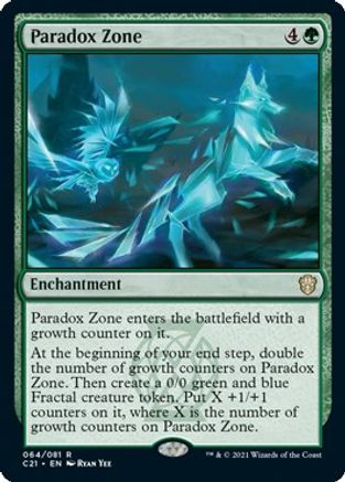At the beginning of your end step, double the number of growth counters on Paradox Zone. Then create a 0/0 green and blue Fractal creature token. Put X+1/+1 counters on it, where X is the number of growth counters on Paradox Zone.