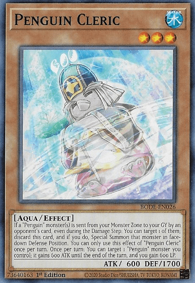 If a "Penguin" monster(s) is sent from your Monster Zone to your GY by an opponent's card, even during the Damage Step: You can target 1 of them; discard this card, and if you do, Special Summon that monster in face-down Defense Position. You can only use this effect of "Penguin Cleric" once per turn. Once per turn: You can target 1 "Penguin" monster you control; it gains 600 ATK until the end of the turn, and you gain 600 LP.
