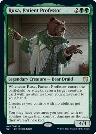 Whenever Ruxa, Patient Professor enters the battlefield or attacks, return target creature card with no abilities from your graveyard to your hand.