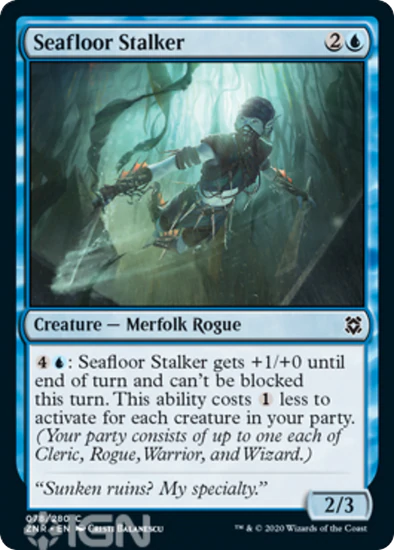 4U: Seafloor Stalker gets +1/+0 until end of turn and can’t be blocked this turn. This ability costs 1 less to activate for each creature in your party. (Your party consists of up to one each of Cleric, Rogue, Warrior, and Wizard.)