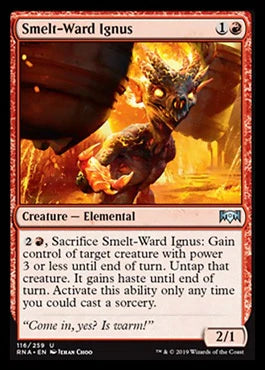 2R, Sacrifice Smelt-Ward Ignus: Gain control of target creature with power 3 or less until end of turn. Untap that creature. It gains haste until end of turn. Activate this ability only any time you could cast a sorcery.