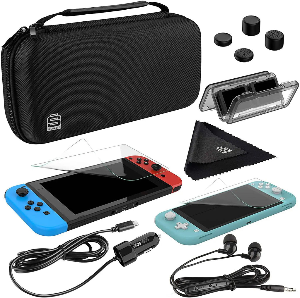 - Includes a car charger with built-in USB-C cable, 4-game mini storage case, two screen protectors, earbuds, four thumb grips, a nylon case, and a system cleaning cloth
