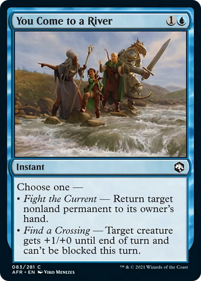 Choose one — •Fight the Current— Return target nonland permanent to its owner's hand. •Find a Crossing— Target creature gets +1/+0 until end of turn and can't be blocked this turn.